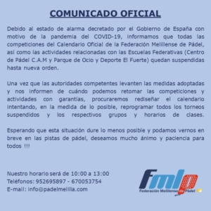 COMUNICADO OFICIAL 27 marzo 2020/en 2020, Noticias /por Padel Melilla Compartir esta entradaCompartir en FacebookCompartir en...
